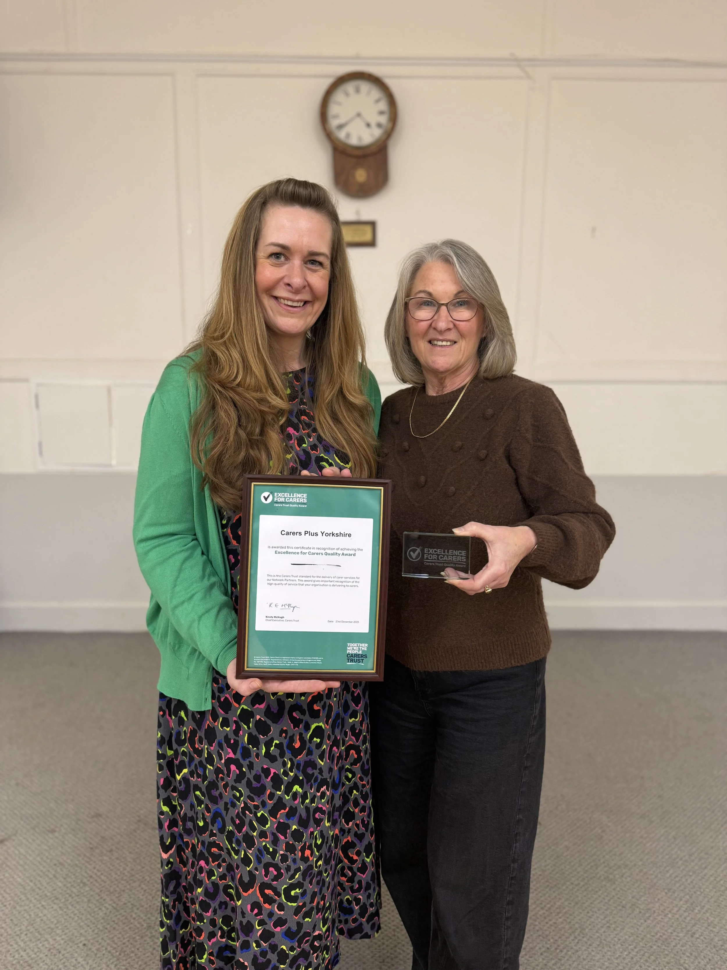 Carers Trust is delighted to have presented the Excellence for Carers Award to Carers Plus Yorkshire. The award is a Carers Trust standard for best practice in services, advice and information for unpaid carers. Carers Plus Yorkshire, part of Carers Trust's network of local carer organisations, was rigorously assessed for its service, as well as the quality of its leadership, staff, internal processes and engagement with key local partners and stakeholders. (Pictured right, Elizabeth McPherson, CEO and left, Jodie Peckitt, Quality Assurance Lead)